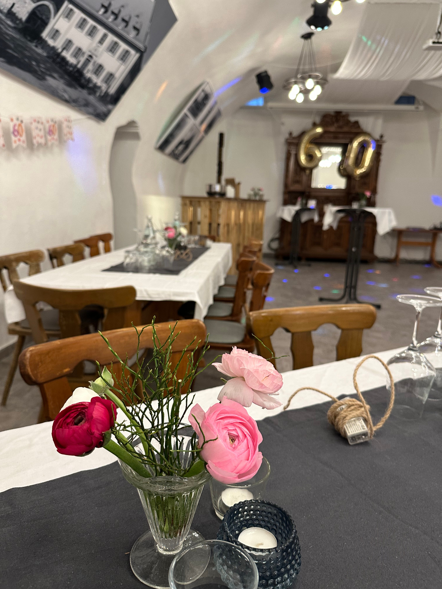 Unter dem Motto: "Fränkischer Abend" mit den Farben Rot/Weiß wurde mit ca. 45 Gästen ein 60. Geburtstag gefeiert. Im Hof wurden die Gäste zum Sektempfang und mit einer Fotobox begrüßt, bis es zum Fränkischen Menü hinunter in den beheizten Gewölbekeller ging.